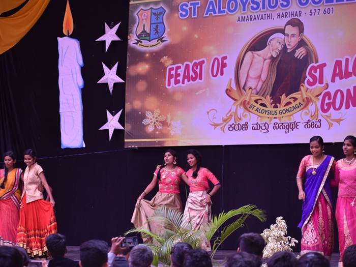 The day began with mass celebrated by the most Reverent Bishop Francis Serrao SJ, Bishop of Shivmoga Diocese; concelebrated by Fr. Antony Peter, parish priest of Harihar church; Fr. Eric Mathias SJ, superior and Principal of Aloysius degree college; Fr. Santhosh Fernades SJ, principal of Aloysius PU college and Fr. Padeep Sequira, finance officer of Aloysius college, Harihar. In the sermon, the Bishop narrated and briefed the life of St. Aloysius Gonzaga, while giving a few values of St. Aloysius that every Aloysian should follow.